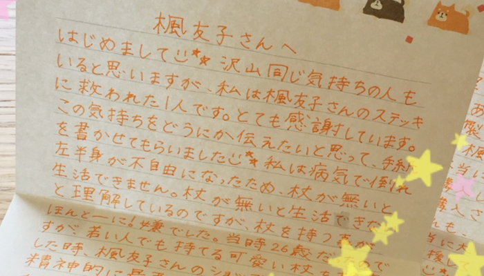 はじめまして(^^)沢山同じ気持ちの人もいると思いますが、私は楓友子さんのステッキに救われた1人です。とても感謝しています。 大げさかもしれないけど、杖が可愛いのは私にとって本当に大きな事で、今では可愛い杖を堂々と使用できる事が私の自慢です!!(^^)→ 続きを見る