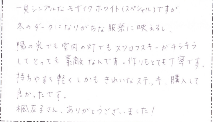 一見シンプルなモザイクホワイト(スペシャル)ですが冬のダークになりがちな服装に映えるし、陽の光でも室内の灯でもスワロフスキーがキラキラしてとっても素敵なんです。作りもとても丁寧です。持ちやすく軽くしかも綺麗なステッキ、購入して良かったです。楓友子さん、ありがとうございました!→ 続きを見る