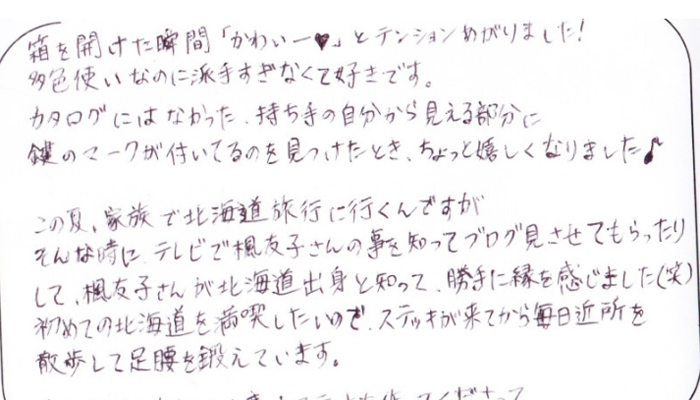 箱を開けた瞬間「かわいー」とテンション上がりました!多色使いなのに派手すぎなくて好きです。カタログにはなかった、持ち手の自分から見える部分に鍵のマークがついてるのを見つけたとき、ちょっと嬉しくなりました♪この度はステッキを作ってくださって本当にありがとうございました。→ 続きを見る